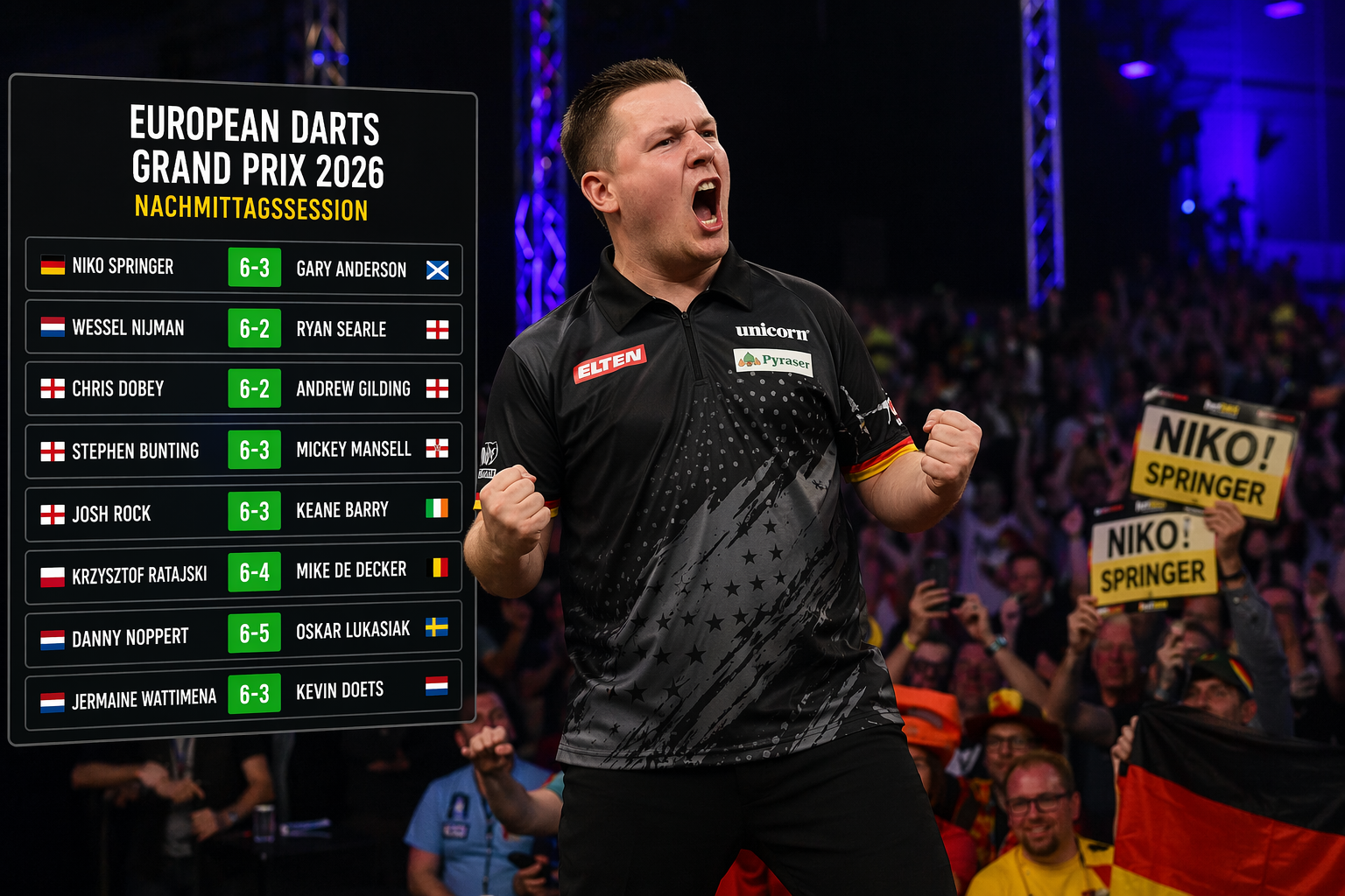 Der European Darts Grand Prix 2026 hat in der Nachmittagssession am Tag 2 den nächsten Schub bekommen – und vor allem Niko Springer hat dabei ein Ausrufezeichen gesetzt. Der Deutsche besiegte Gary Anderson mit 6:3 und sorgte damit für eines der auffälligsten Ergebnisse des Tages. Parallel blieben auch Wessel Nijman, Chris Dobey, Stephen Bunting und Josh Rock auf Kurs, sodass sich das Feld vor der Abendsession bereits deutlich sortiert hat. Gerade das macht diesen Zwischenstand interessant: Der Draw ist nicht mehr nur in Bewegung, er ist bereits spürbar aufgegangen.