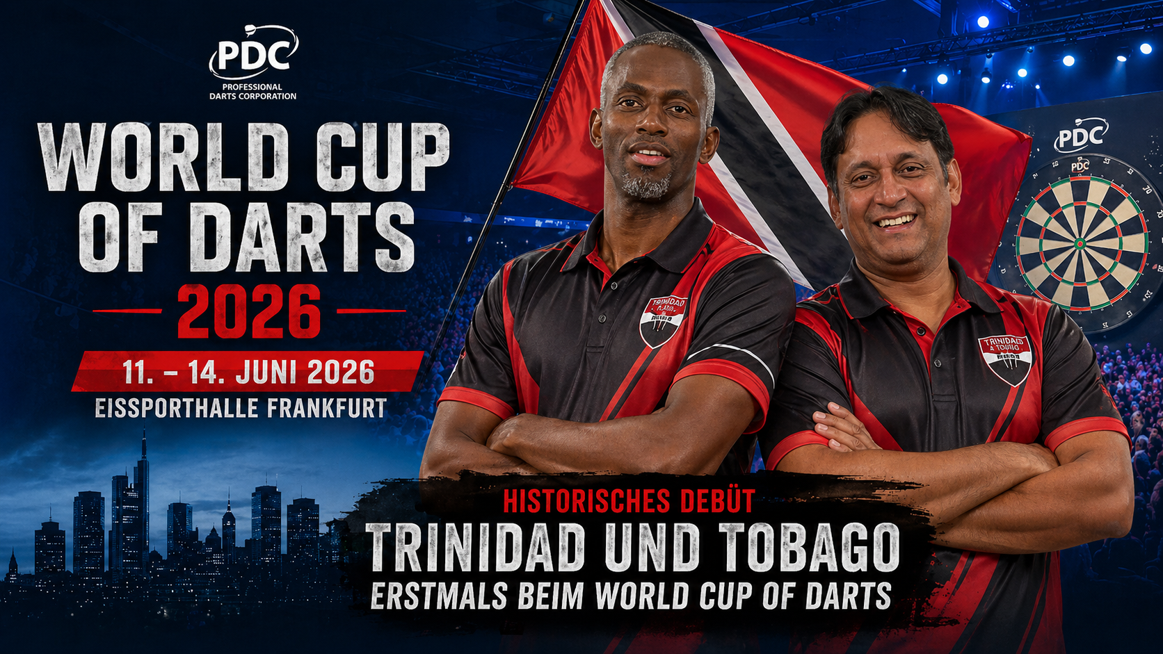 Trinidad und Tobago wird beim World Cup of Darts erstmals dabei sein. Wie die PDC mitteilte, sicherte sich das Duo Joshua Balfour und James Walklin den Startplatz über den CDLC-Qualifier und sorgte damit für einen besonderen Moment in der World-Cup-Geschichte. Im entscheidenden Spiel setzte sich Trinidad und Tobago deutlich mit 10:1 gegen die Bahamas durch. Für Balfour und Walklin bedeutet der Sieg die Qualifikation für den World Cup of Darts, der vom 11. bis 14. Juni 2026 in der Eissporthalle Frankfurt ausgetragen wird.